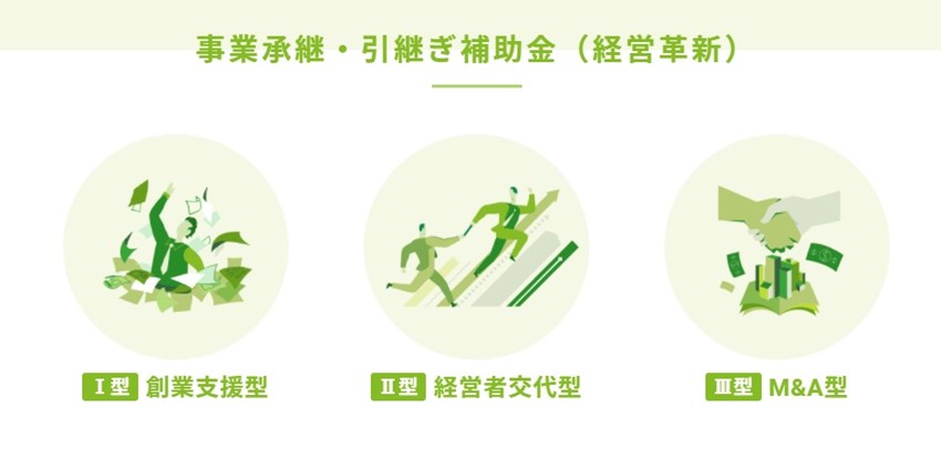 さらに、「事業承継・引継ぎ補助金(経営革新)」には、「創業支援型」「経営者交代型」「M&A型」の3種類、「事業承継・引継ぎ補助金(専門家活用)」には、「買い手支援型」と「売り手支援型」の2種類があります。