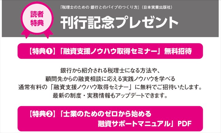 特典1 通常 5,610円(税込) の「融資支援ノウハウ取得セミナー」 に無料招待